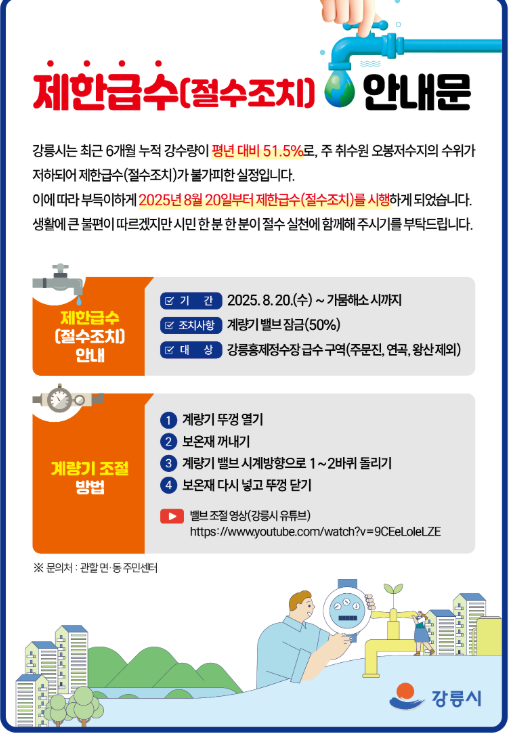 강릉시는 자연재해로는 처음으로 재난사태를 선포하고, 수도 계량기 75% 잠금 제한급수를 시행했습니다