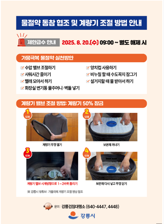 시간대별로 급수 제한이 있을 수 있으므로, 현지 시간제를 확인하고 대비해야 합니다. - 절수 실천으로 지역사회에 동참