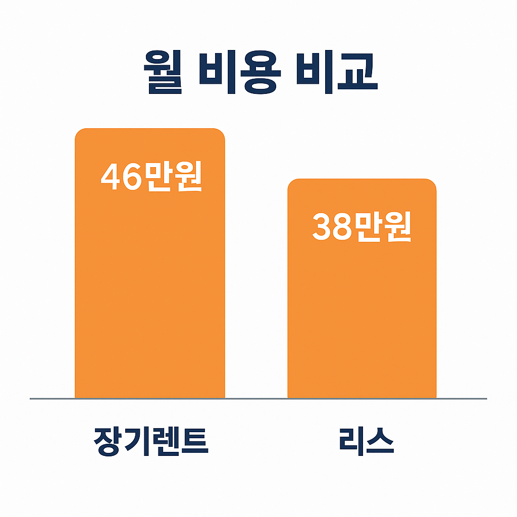 여기에 자차 보험료로 매달 10만원이 더 들어간다면, 실제 비용은 리스 48만원 vs 장기렌트 46만원으로 역전되기도 했습니다. 즉, 보험 방식에 따라 어느 쪽이 더 유리할지 달라질 수 있다는 점이 핵심입니다.